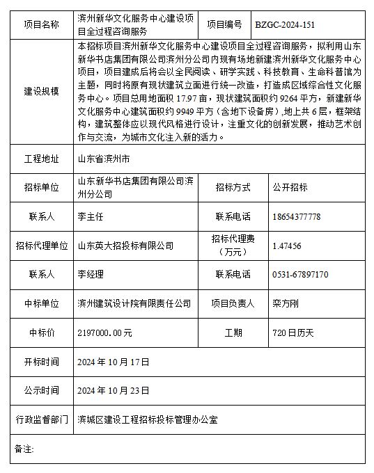 滨州新华文化服务中心建设项目全过程咨询服务中标公示